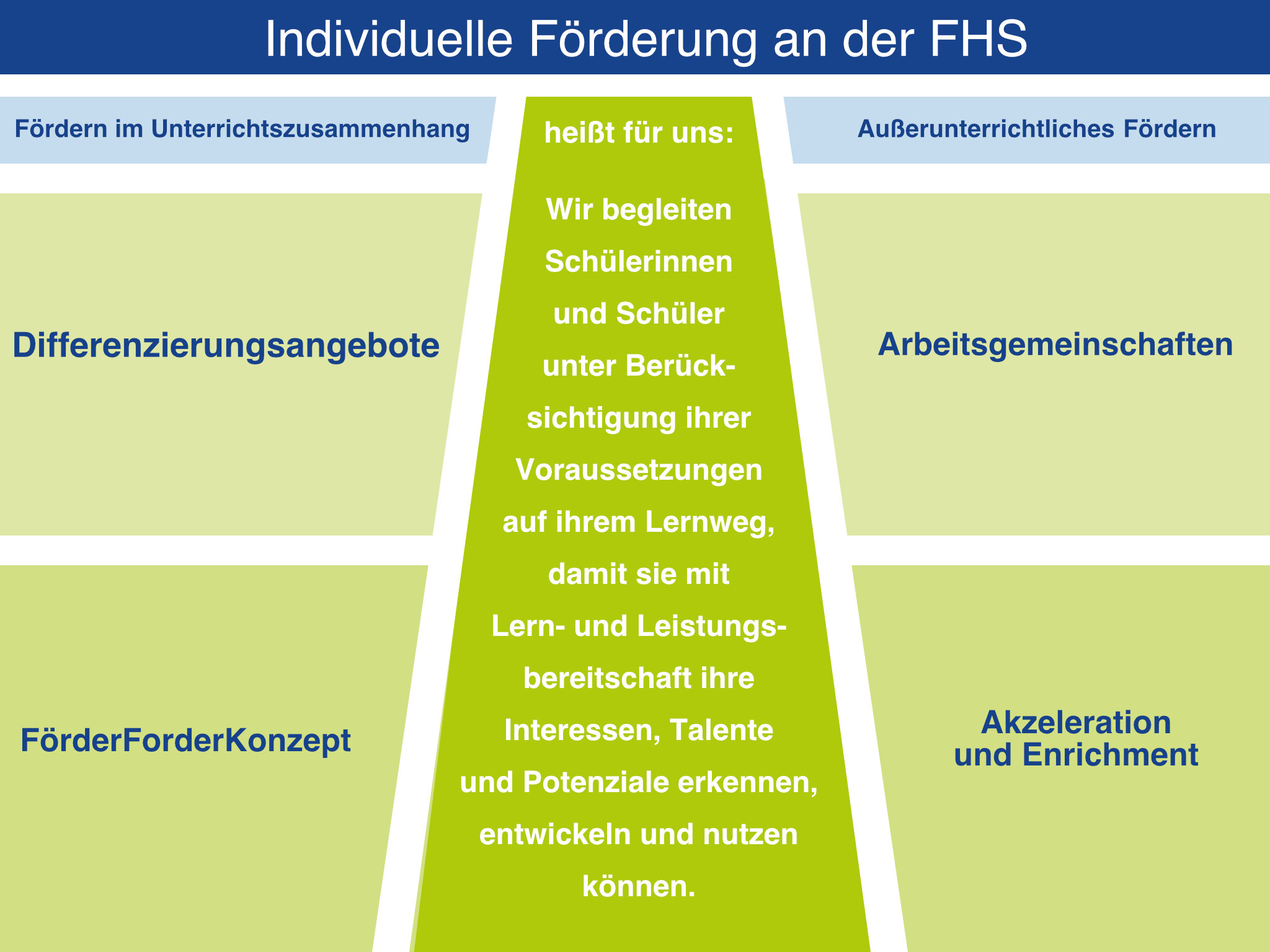 Die spürbare Umsetzung der individuellen Förderung ist in der FHS schon seit langer Zeit ein grundlegendes pädagogisches Prinzip und besonderes Anliegen. Um auf die vielen verschiedenen Voraussetzungen, persönlichen Schwierigkeiten und Talente möglichst passgenau eingehen zu können, arbeiten wir fortwährend an unserem großen Förder- und Forder-Angebot und bilden uns weiter fort. Dabei integrieren wir neuste Forschungsergebnisse und digitale Medien.