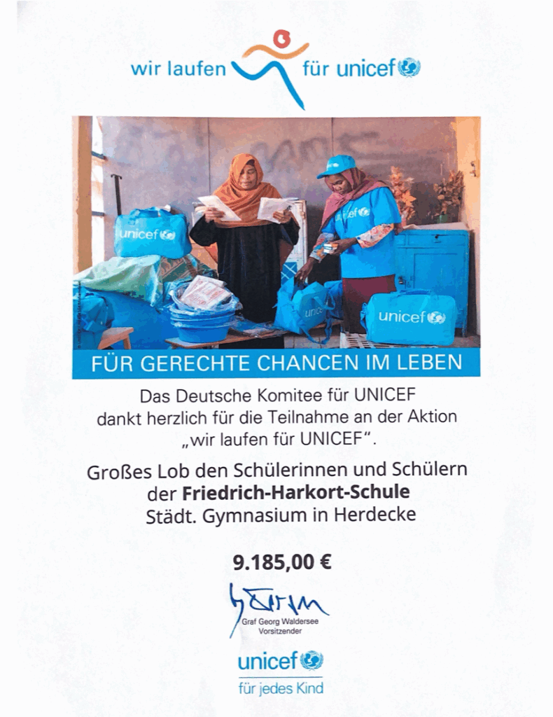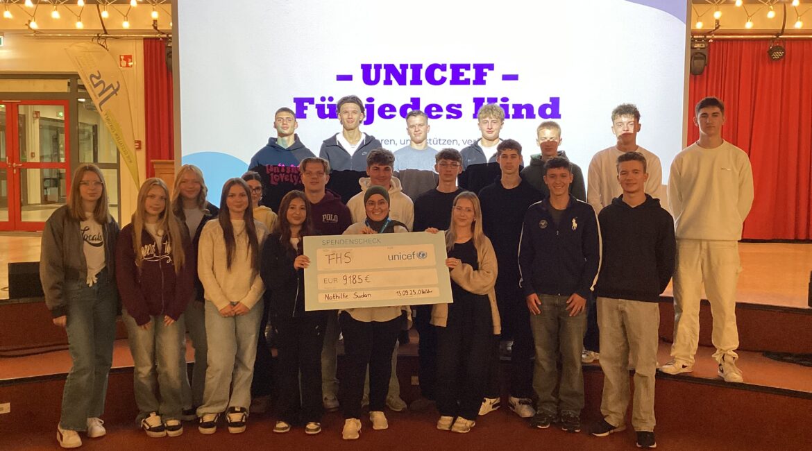 Das wollten wir nicht hinnehmen. Deshalb starteten wir das Projekt Spendenlauf, um Aufmerksamkeit zu schaffen und aktiv Hilfe zu leisten. Der Lauf war ein großer Erfolg: Dank Ihrer und eurer Unterstützung konnten wir die beeindruckende Summe von 9.185 € sammeln. Diese durften wir am Montag, den 12.09.2025, offiziell an UNICEF übergeben.