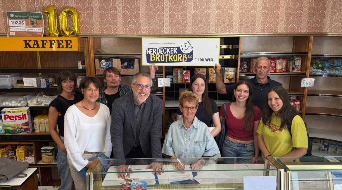 Die alte Bäckerei am Sonnenstein 25 ist seit einigen Jahren wieder zu neuem Leben erwacht. Wo früher frische Brötchen über die Theke gingen, verteilen heute die ehrenamtlichen Mitarbeiter und Mitarbeiterinnen des Herdecker Brotkorb e.V. Lebensmittel an Menschen, die ihre Grundversorgung aufstocken müssen. Seit dem 13. Mai 2025 werden sie dabei von Schülerinnen und Schülern der EF (11.Klasse) der Friedrich-Harkort-Schule tatkräftig unterstützt! Dieses ehrenamtliche Engagement haben Gabriele Langer, Armin Neuhaus, Stefan Woicke vom Brotkorb e.V. und Andreas Joksch (Schulleiter der FHS), Anne Krüger-Kindler, Martin Schneider, Melanie Tritthart (Team „Soziales Lernen“, SV-Lehrkräfte), sowie die Schülerinnen Lea Jezierski, Paula Lischek und Johanna Huck am 13.Mai in einem Kooperationsvertrag fest vereinbart.